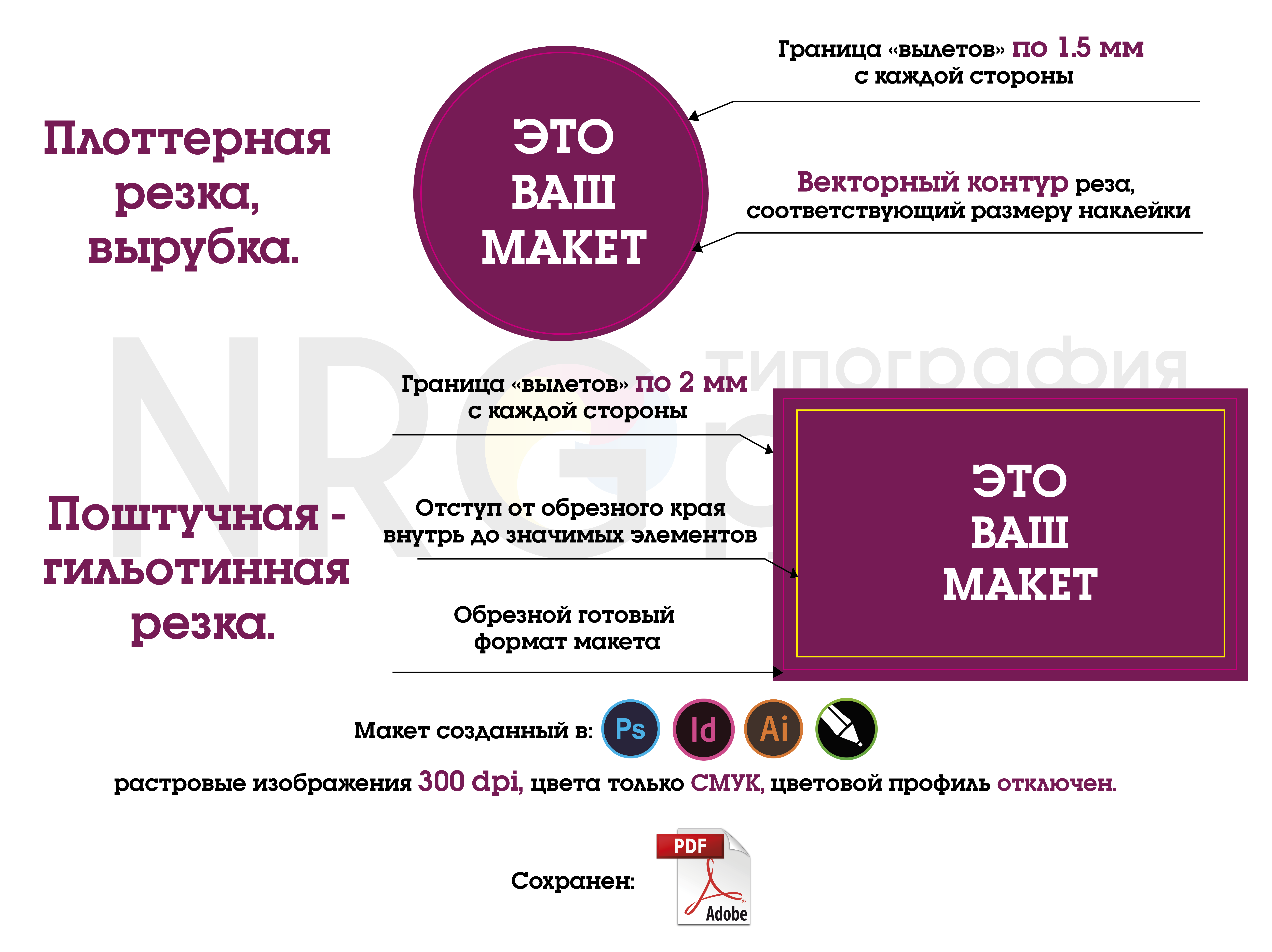 Версии не новее Х19, все шрифты в кривых, вылеты под обрез не менее 4 мм в каждую сторону.